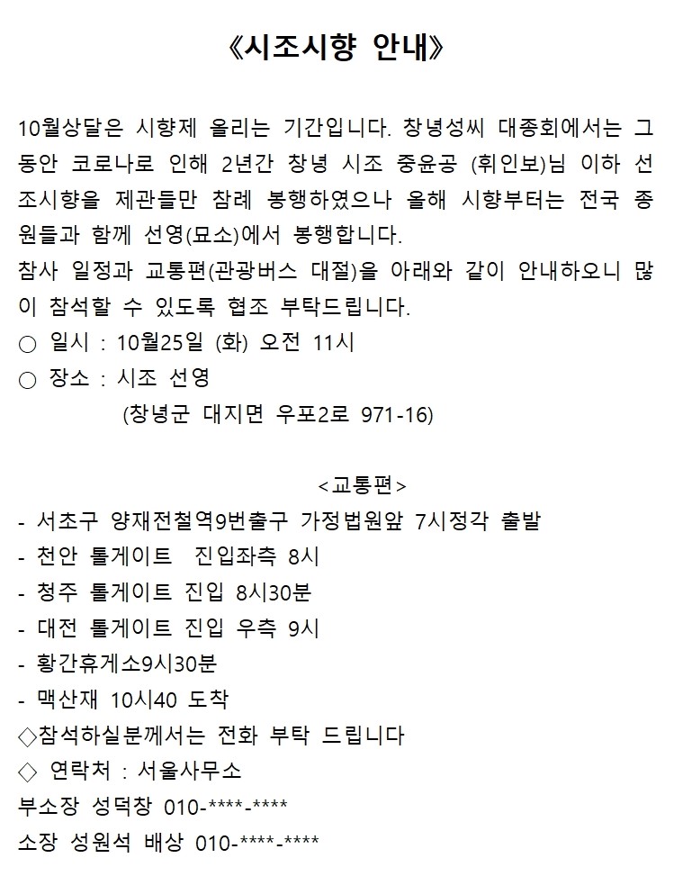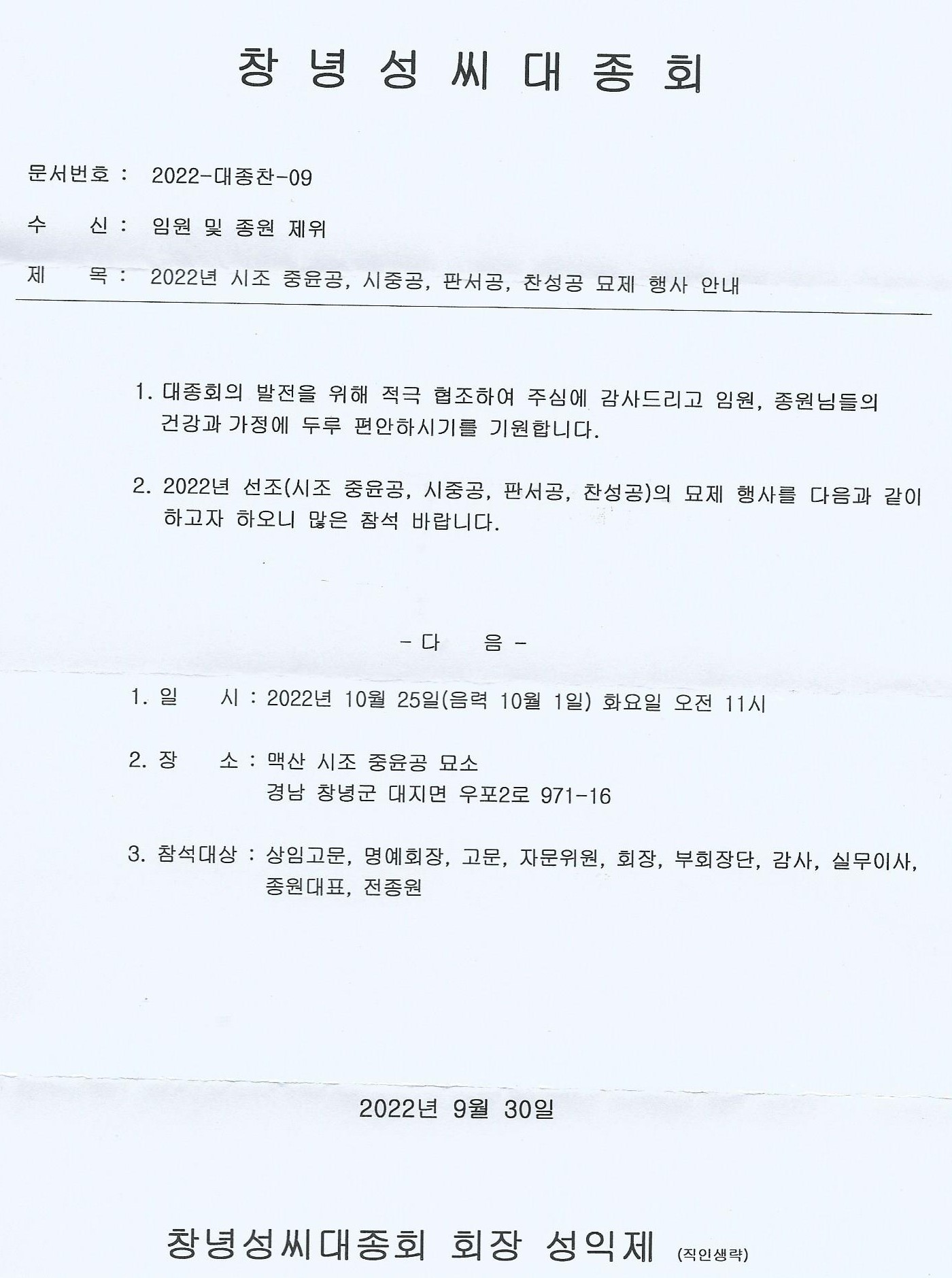 [공지] 2022년 시조 중윤공, 시중공, 판서공, 찬성공 묘제 행사안내