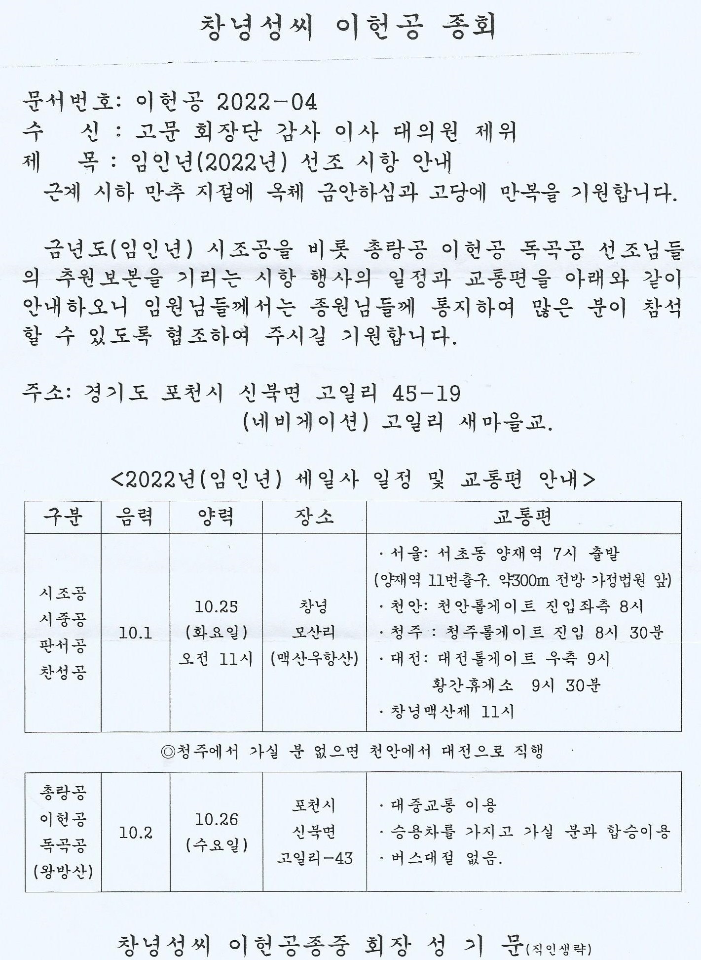 임인년(2022년) 선조 시향 안내