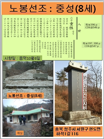 첨추공 (노봉묘소) 문중 ●휘 중성 重性 (7세) / 묘제 ●일시 : 음 10월 6일/양력 2019년 11월 2일(토) 10시 ~ ●장소 : 충북 청주시 서원구 현도면 하석1길 116 ●휘 적 迪 (9세) 묘제 ●일시 : 음 10월 6일/양력 2019년 11월 2일(토) 13시경 ●장소 : 세종특별자치시 부강면 시목부강로 290-6번지 ●휘 세충 世忠 (10세), 순 淳 (11세) /수의 壽義 (12세) ●일시 : 음 10월 6일/양력 2019년 11월 2일(토)14시경 ●장소 : 세종특별자치시 부강면 노호리 산58번지 2019 노봉(중성/8세)시향안내 상곡공(휘 석연)의 손자 (휘 중성/8세)시향입니다 상곡공 손자이신 노봉 시제행사가 2019년11월초2일 토요일(매년 음10.6) 오전 10시 휘 중성 重性(8세) 묘소가 위치한 충북 청주시 서원구 현도면 하석1길 116 에서 묘제를 지내고, 부강면으로 이동하여 첨추공(급)의 손자이신 (휘 적/9세)시향을 매포(세종특별자치시 부강면 시목부강로 290-6번지에서 적(9세)설단 할아버지 이하 세충(10세) 3분, 순(11세) 3분, 수의(12세) 묘제로 봉행 예정입니다.