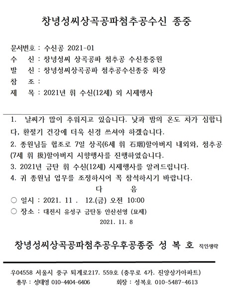 2021년 상곡공파(휘 석인/6세) 시향 소식을 전합니다. 상곡공파(종회장 성봉경) 정평공 시제가 2021년 11월 7일(음력 10.3) 일요일 오전 11시부터 성봉경 회장 외 공도공, 희정공, 첨추공 문중종원 30여 명이 참석하여 상곡공파 내외분(6세 石姻/석인)할아버님과 (정경부인 서산유씨)할머니, 그리고 막내 아드님이신 휘 給/급(7세) 내외분 시제 행사가 서울시 서초구 우면동 산63번지에서 묘제로 거행되었습니다. 제실 관리인 윤재호 씨의 부제로 2019년도부터 집행부에서 묘소 벌초, 시향 제수 등 관리를 직접 준비하고 있습니다.